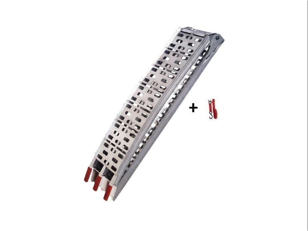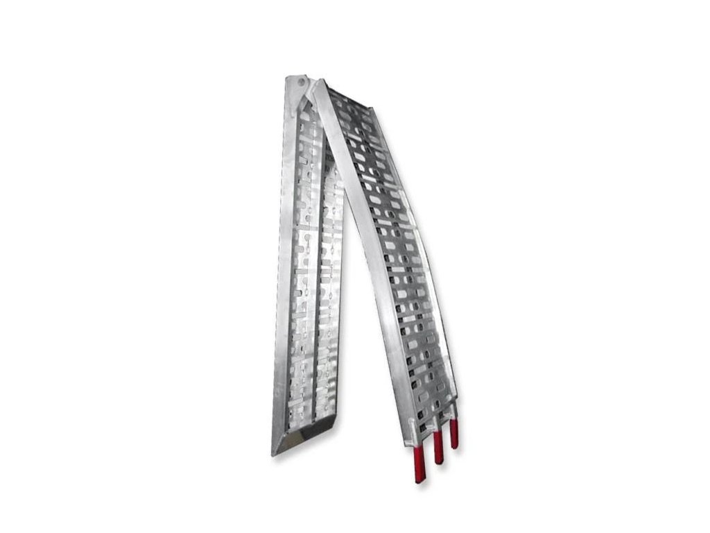Skladacia hliníková nákladacia rampa SHARK pre motocykle. Jej rozmery sú rozmery 225 x 28 cm nosnosť je 340kg. Rampa je vyrobená z vysoko kvalitného hliníku. Je ľahko prenosná aj vďaka tomu že sa dá sklopiť na 2 polovice. Vďaka svojmu zakrivenému tvaru neprichádza pri nakladaní k zachytávaniu spodnej časti motocykla. Ku každej rampe výrobca dodáva aj 1 ks upínací popruh na zaistenie sklopenej rampy.