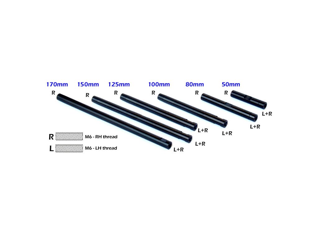 Všetky tyčky majú na jednej strane pravý závit M6 a na druhej strane M6 Dual (pravý aj ľavý závit zároveň).